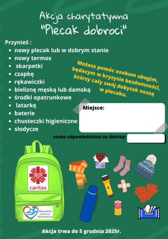 W listopadzie nasza szkoła włącza się w akcję charytatywną Caritas: "Plecak dobroci".