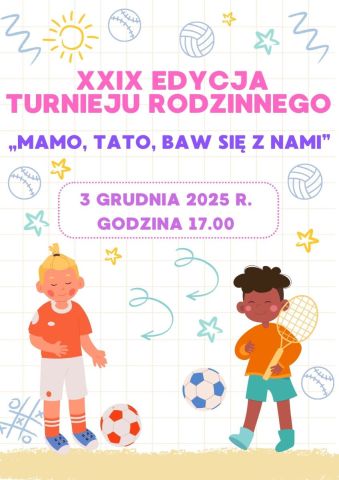 3 grudnia (środa) 2025 r. o godz. 17.00 w sali gimnastycznej odbędzie się XXIX edycja TURNIEJU RODZINNEGO „MAMO, TATO, BAW SIĘ Z NAMI”.