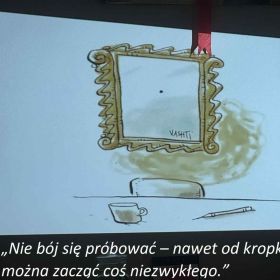 Na zakończenie zajęć uczniowie otrzymali kartki z narysowanymi kropkami i mieli za zadanie przekształcić je w coś zupełnie nowego. Powstały wspaniałe, pomysłowe prace, które pokazały, że z jednej małej kropki może narodzić się coś więcej.