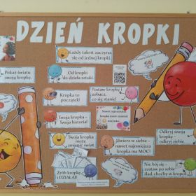 Podczas zajęć uczniowie w bibliotece szkolnej w budynku A przebywający w czytelni, zostali wprowadzeni w historię kropki. Obejrzeli filmik, z którego dowiedzieli się dlaczego kropka jest symbolem odkrywania talentów. Następnie odbyła się rozmowa o tym, że każdy z nas jest wartościowy, ma ukryte zdolności i że warto próbować, nie poddawać się i wierzyć w siebie.