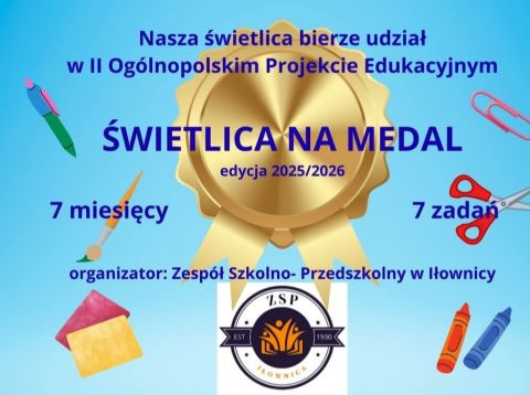 W roku szkolnym 2025/2026 świetlica naszej szkoły bierze udział w ogólnopolskim projekcie „Świetlica na Medal”. Celem projektu jest promowanie aktywnego i twórczego sposobu spędzania czasu przez uczniów w świetlicy oraz poszerzanie ich wiedzy z różnych dziedzin — zwłaszcza z zakresu edukacji prozdrowotnej, obywatelskiej, patriotycznej, doradztwa zawodowego, bezpieczeństwa w sieci, sztucznej inteligencji oraz myślenia analitycznego. W ramach projektu będziemy realizować różnorodne działania rozwijające kreatywność, współpracę, empatię oraz umiejętności społeczne naszych wychowanków. Uczniowie wezmą udział w ciekawych zajęciach tematycznych, grach zespołowych i warsztatach artystycznych. Udział w projekcie stanowi dla nas ogromną motywację do dalszego rozwoju naszej świetlicy — miejsca, w którym każde dziecko może czuć się ważne, bezpieczne i wyjątkowe.